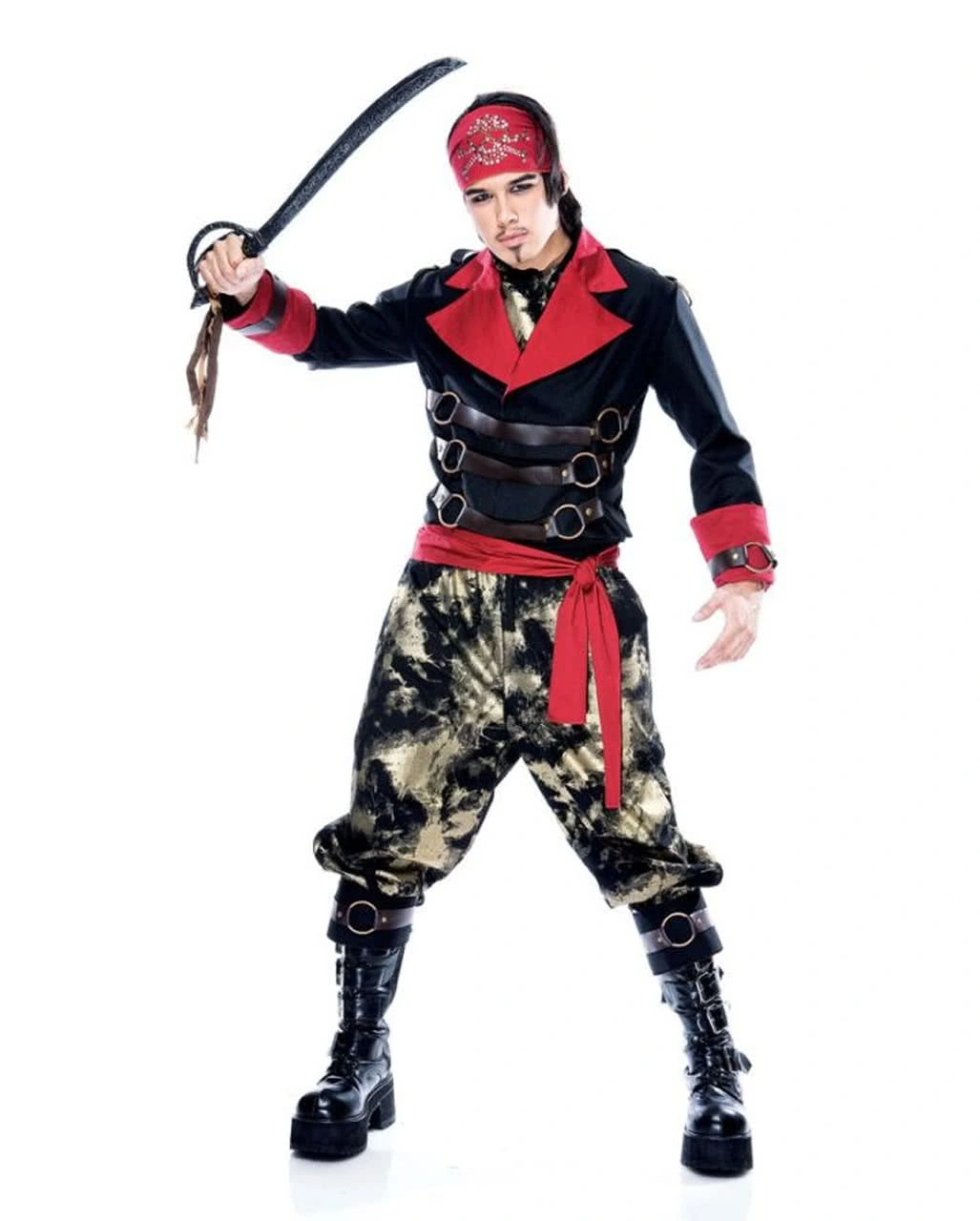 Das Kostüm besteht aus der schwarzen Jacke mit rotem Kragen und Manschetten mit Details aus Kunstleder und Metallringen, Hosen und Schal im schwarzen und goldenem Print, rote Schärpe und Bandana mit Totenschädel im Look von silbernen Pailletten. Mit dem passenden weiblichen Gegenstück dem Steampunk Piraten Maid Kostüm L und der entsprechenden Bewaffnung, z.B.: der Goldene Piraten Pistole mit Effekt wirst du zum Helden einer alternativen Zeitlinie.