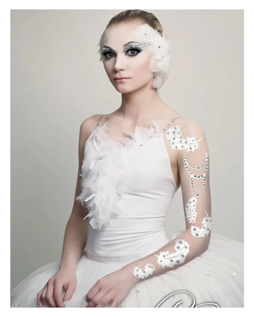 Das Body Art Tattoo besteht aus fünf verschieden großen Schwanenfedern, die mit Strass und Glitzer verziert sind. Passend dazu gibt es unser White Swan Make Up , das deinem eleganten Look den letzten Schliff verpasst. Wenn du das Klebe Tattoo vorsichtig wieder abziehst, kannst du es sogar mehrfach verwenden, indem du es gegebenenfalls mit etwas Mastix Hautkleber klein fixierst. Dieses Body Art Tattoo ist eine Neuheit aus den USA und von Theater und Film längst nicht mehr wegzudenken, denn so schnell bekommst du normalerweise keine perfekten Federn auf die Haut.