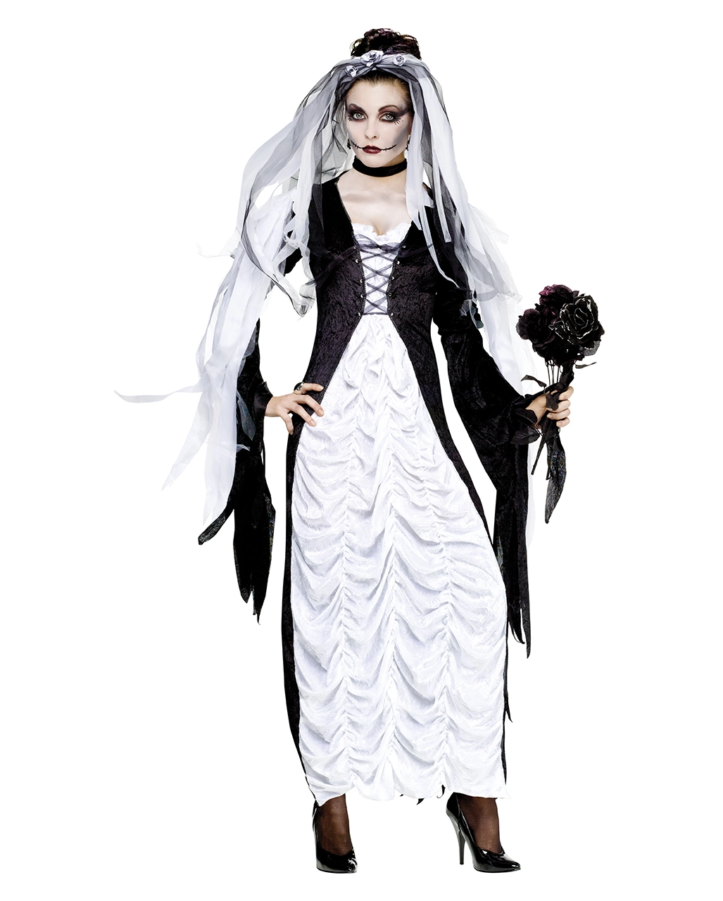 Die Braut der Finsternis ist bekannt dafür, dass keiner ihrer Ehegatten länger als ein paar Monate zu leben hat! Unschuldig an ihr der schwarzen Witwe ist nur der weiße geraffte Rock! Das Braut der Finsternis Kostüm besticht durch seine wunderbare, edle Optik. Das bodenlange Hochzeitskleid ist aus schwarzem Samt mit weißem gerafften Satin auf der Vorderseite, schwarzen Fransenärmeln, Gaze-Schleier und Halsband.