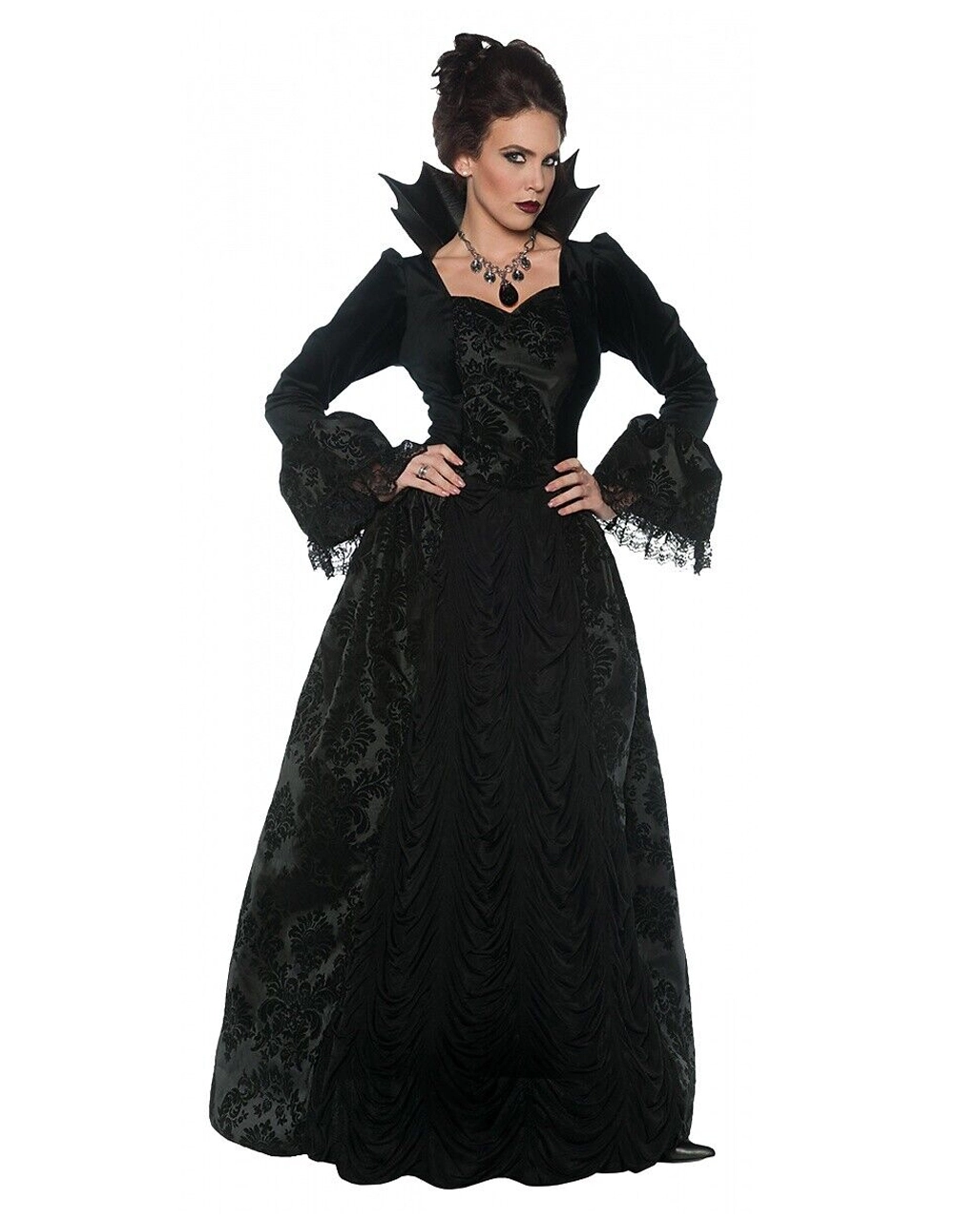 Das Dunkle Märchenkönigin Kostüm ist ein schwarzes Gothic Ballkleid mit Stehkragen. Es handelt sich um ein mit Liebe zum Detail gearbeitetes Damenkostüm im viktorianischen Stil. Ausladende Spitzenärmel sowie eine Raffung in der Mitte des Kleides sorgen für einen romantisch-düsteren Look und passen ideal zu deinem königlichen Auftritt. Dieses Dunkle Märchenkönigin Kostüm ist in S-XL Größe verfügbar. Trage hierzu eine unserer Halloween Perücken. Wie wäre der Look unserer Mätresse Perücke Schwarz?