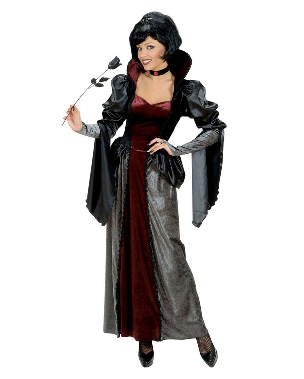Mit dem dunkle Vampir Königin Kostüm Deluxe kannst du in der Halloween Nacht auf die Suche nach frischem Blut gehen. Das elegante Halloween Abendkleid verkleidet dich eine extravagante Blutgräfin, der keine Männer widerstehen können – es sollte genug Blut für dich in den Männer Hälsen vorhanden sein.