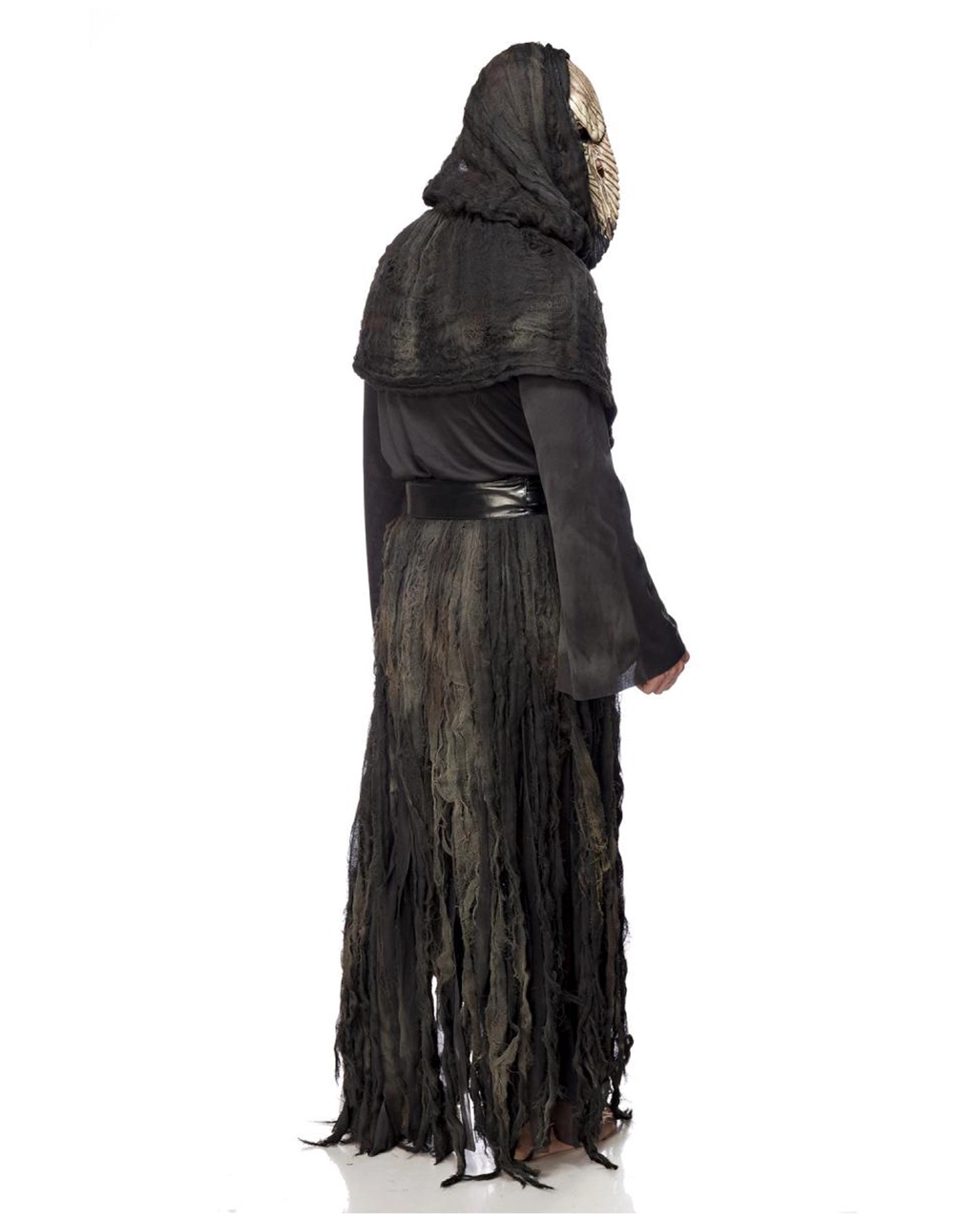 Unser Komplettset für Männer besteht aus langärmeligem Oberteil, Herrenrock im Fetzenlook, Kapuzencape, Gürtel, der fantastisch aussehenden Maske und der mit Raben-Skelettschädeln verzierter Halskette. Das gesamte Outfit sieht durch verschiedene Lagen, Farbspritzer und Fetzen verschlissen und gebraucht aus, was den Endzeit-Look unterstreicht und letztlich das gesamte bedrohlich wirkende Pestdoktor Kostüm ausmacht. Die Schnabelmaske ist aus Latex gefertigt und besitzt mit Netz unterlegte Augenaussparungen. Mit flexiblem Gummiband gehalten, sorgt die Maske für den optimalen Sitz unter dem Kapuzencape. Den Abschluss bildet die Halskette mit Kunststoff Raben Sklettschädel.