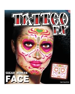 Das Face Tattoo Sugar Skull weiblich verwandelt dich im Handumdrehen in eine perfekt geschminkte La Catrina. Als süße und farbenprächtige Sugar Skull Braut wirst du an Halloween nicht lange alleine bleiben. Bei deinem hübschen Tag der Toten Make-up werden sich bald schon Skelette und Zombies zu dir gesellen, um mit dir die Ewigkeit zu verbringen.