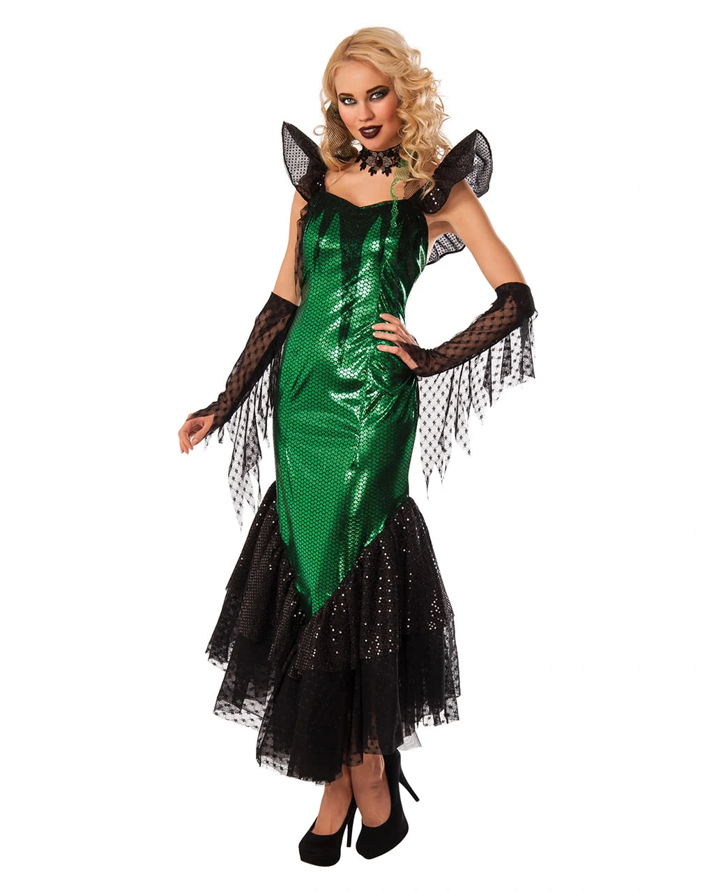 Das Gothic Meerjungfrauen Kostüm besteht aus einem knöchellangen Kleid, zwei Handschuhen, einem Kropfband und einer Haarklammer. Das Kleid des Märchen-Kostüms ist in einem dunklen Grünton gehalten mit zahlreichen stilisierten Schuppen. Der schwarze Tüll am unteren Ende des Nymphen-Kleides ist so geschickt angeordnet, dass der typische Schwanzflossen-Look entsteht. Mit zwei seitlich angenähten Bändern kannst du dein Sirenen-Kleid noch taillierter schnüren. Feine, spitzenbesetzte lange Handschuhe mit abstehenden Elementen wie bei Fischflossen unterstützen den geheimnisvollen Meeresbewohner-Anblick zusätzlich. Das schwarze Kropfband weist vorne eine silberne Blume mit Rubin als Blüte auf und wird mittels Karabiner im Nacken geschlossen. Abgerundet wird die sexy Halloween-Verkleidung durch den Haarschmuck, schwarzen und grünen Bändern in Netzoptik, die mittels Klammer unkompliziert ins Haar gesteckt werden. Zahlreiche glänzende Pailletten schmücken das Nixen-Kostüm und erwecken den Eindruck von vielen kleinen Wassertropfen. Dazu passen die Siren Langhaar Perücke schwarz und Schwarzer Nagellack und Lippenstift.