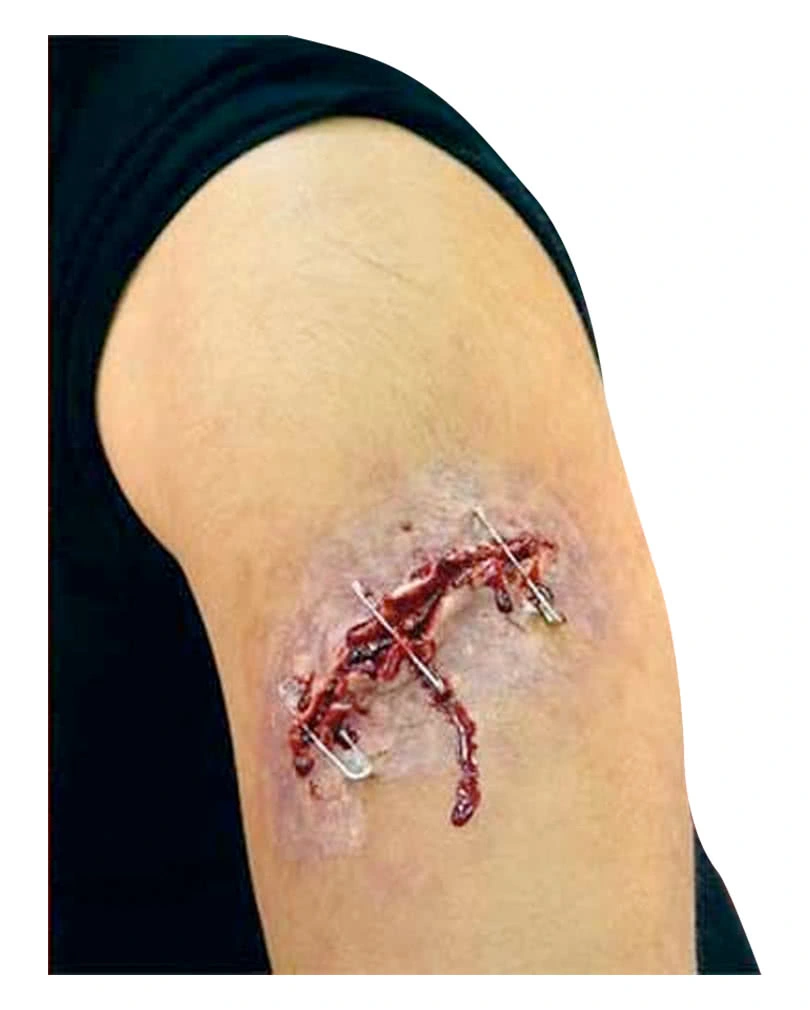 Die Latexapplikation wird mit Mastix Hautkleber oder Flüssiglatex auf die vorher gereinigte Stelle geklebt. Die Ränder und übergänge lassen sich mit Flüssiglatex und Make-up kaschieren. Jetzt noch etwas Filmblut und schon besitzt du eine fantastisch aussehende Sicherheitsnadel Wunde als realistische Unfalldarstellung. Die Latexwunde lässt sich immer wieder verwenden.Mastix Hautkleber klein , Hautfarben Make Up Kit / Flesh Stack und Blut Gel / Blood Gel 30ml nicht inkl.