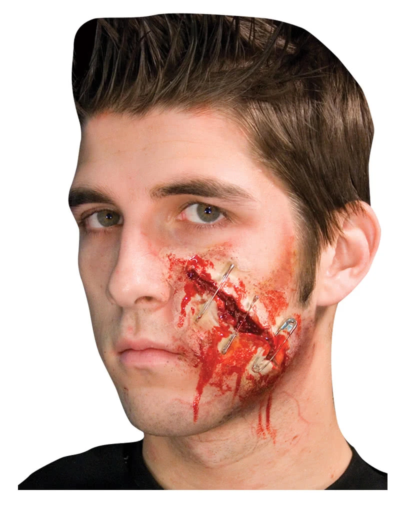 Derbe Spezial make-up Effekte und professionelle Maskenbildner-Tricks, lassen realistische Unfalldarstellung und Splatter Szenen im Horrorfilm und zu Halloween erst spannend aussehen. Schminke Dich doch zu Halloween und Zombie Walk einmal richtig krass und schockiere mit der großen Sicherheitsnadel Latexwunde deine Umwelt. Die große aufgeplatzte Wunde, sieht nach dem Anbringen und Schminken aus, als wäre diese nur noch mit drei Sicherheitsnadeln zusammengehalten.