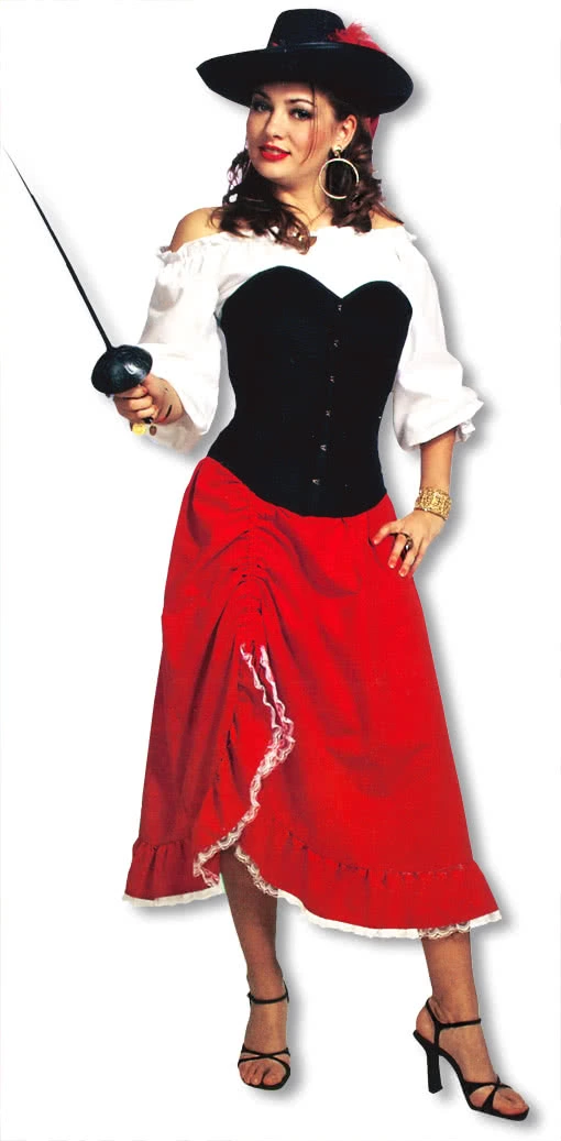 Röcke gibt es in nahezu jeder Form und Farbe und so kann man je nach Stimmung oder Oberteil den richtigen Rock wählen! Ideal ist hier der rote Samtrock Esmeralda. Da er relativ schlicht gehalten ist, passt er super zu verschiedenen Outfitts. Am Bund hat der Rock einen Gummizug und passt sich dadurch an jede Figur an und ist angenehm zu tragen. Der rote samtartige Stoff verleiht dem Rock einen edlen Touch. An der Seite hat der Rock vom Bund bis zur MItte des Rockes eine Raffung. Diese kann nach Belieben gerafft werden, wodurch der Rock an dieser Stelle eine Falte bzw. einen Schlitz bekommt. Unten am Saum des Rockes verläuft bis zur Raffung eine weiße Spitzenborte. Diese verleiht dem Rock das gewisse Etwas und dient als Blickfang. Du kannst den Rock ganz schlicht mit einem weißen Top im Alltag tragen, oder ihn im Fasching mit einer sexy Korsage tragen. So wird ganz schnell aus dir eine scharfe Piratenbraut.