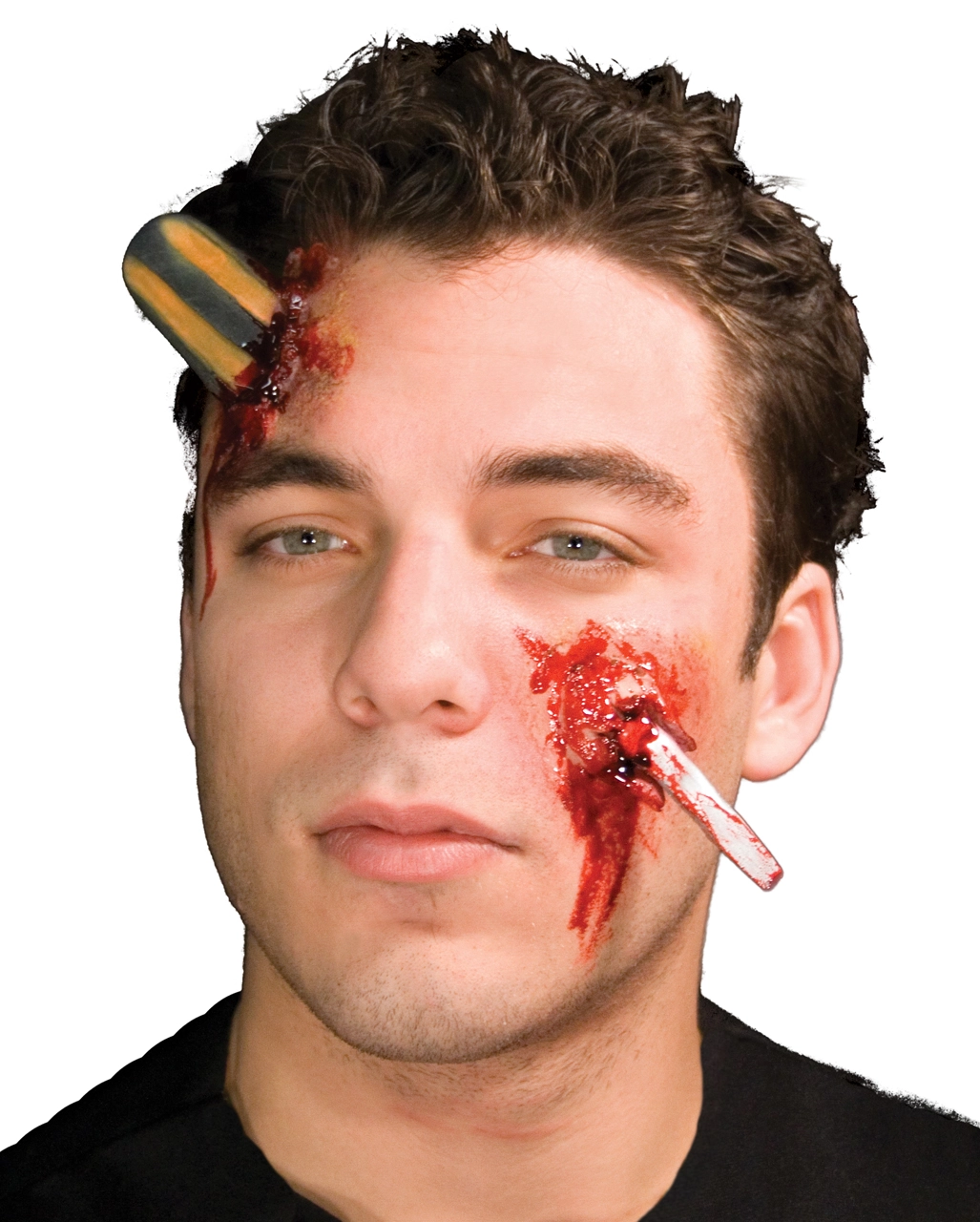 Die zweiteilige Schraubenzieher Wunde besteht aus Latex und beinhaltet Griff und Schraubenzieher Spitze. Das Griffstück kann zuvor noch mit Watte oder weichen Papiertaschentuch ausgestopft werden. Jetzt die beiden Latexapplikationen ganz einfach mit Mastix Hautkleber klein auf die gewünschte Stelle der Haut montieren. Die Übergänge zur Haut können noch mit Flüssiglatex kaschiert werden oder man versteckt diese hinter Make-up und reichlich Filmblut / FX Blood 30ml und etwas dunklerem Blut Gel / Blood Gel 30ml für die Austrittswunde.