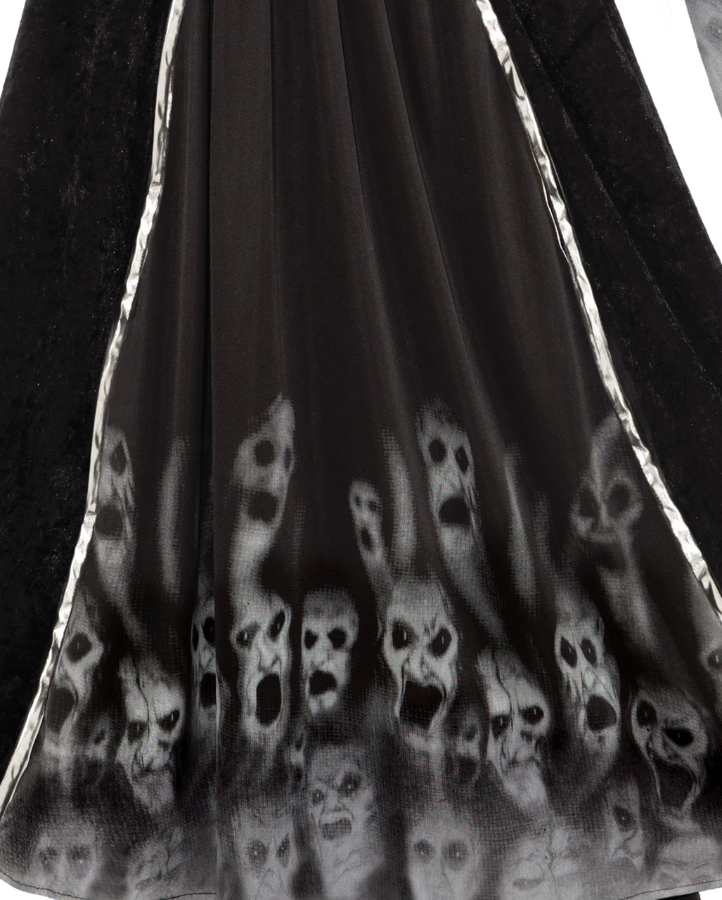 Das Seelenflüsterin Damenkostüm ist eine geniale Halloween Verkleidung, die dir viel Bewunderung einbringen wird. Das wunderschöne schwarze Kapuzenkleid bietet raffinierte Details für eine schlanke Silhouette. Zum Saum hin wird das Kleid weiter, zur Hüfte hin enger. Die feinen silbrigen Nähte und die zur Optik angebrachten schwarzen Schnüre auf dem Oberteil betonen die Taille. Als Motiv sieht man am Saum und an den weiten Trompetenärmeln, die schon ein Hingucker für sich sind, die schreienden Seelen, die du behütest. Passend zu deinem mystischen Halloween Damen Kostüm kannst du dir noch stilecht das Gesicht mit dem Professionelles Creme Make-Up Weiß schminken.