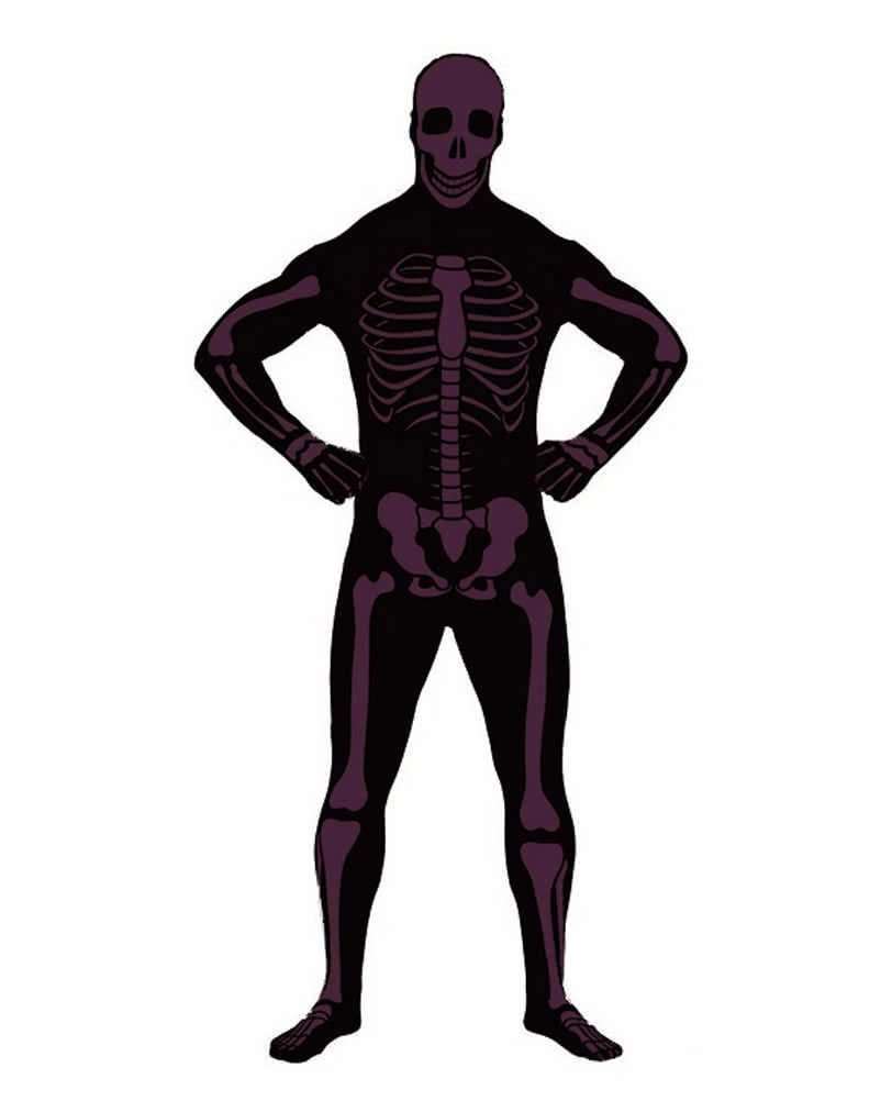 Der hauteng anliegende Skelett Ganzkörperanzug passt sich dank seiner elastischen Eigenschaften dem Körper des Trägers hervorragend an. Auf der Vorderseite ist der fast anatomisch korrekte Aufdruck eines menschlichen Skelettes in violett zu sehen. Du kannst zwar bequem unter dem schwarzen Skelett-Anzug atmen und hindurch sehen, aber wirklich tief blicken lässt das Kostüm nicht. Außerdem werden die Menschen eher auf das gruselige Skelett achten, dass ihnen an Halloween und auf Faschingspartys entgegen kommt. Verkleide dich also an Halloween als gruseliges Skelett oder mit der Geisterrobe Premium Kostüm One Size und 4-tlg. Geistersense 100 cm als Gevatter Tod.