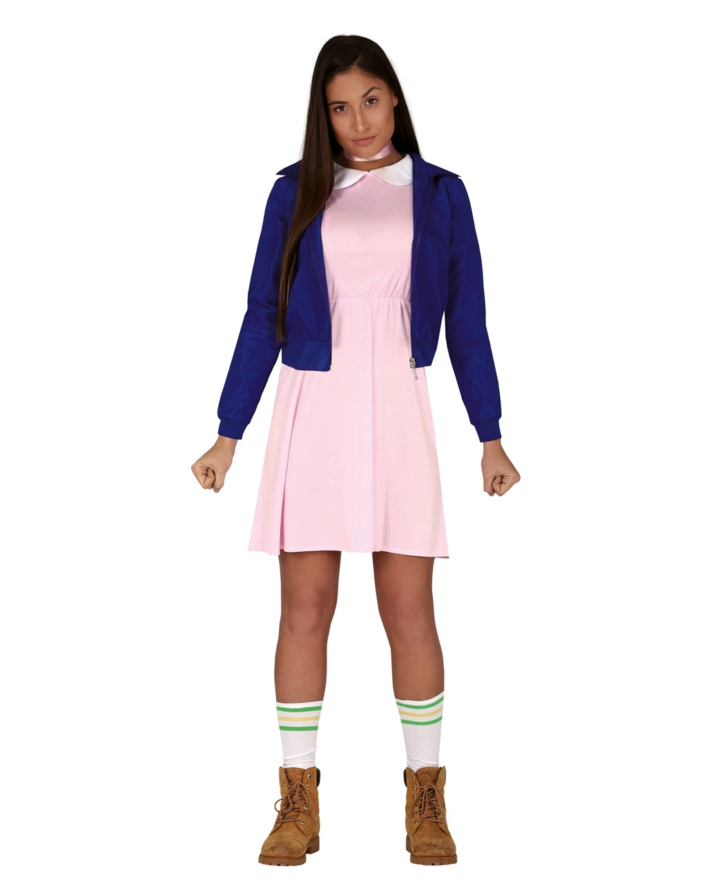 Das Stranger Girl Damenkostüm ist in Größe M und L für Frauen verfügbar. Es besteht aus einem kurzen rosa Kleid mit weißem Bubikragen. Darüber trägst du die blaue Kurzjacke. Komplett wird der 80er Jahre Look mit den gestreiften Beinstulpen. Bestelle hierzu die Strange Girl Perücke Blond. Noch mehr abgefahrene Verkleidungen findest du in unserem Onlineshop.
