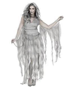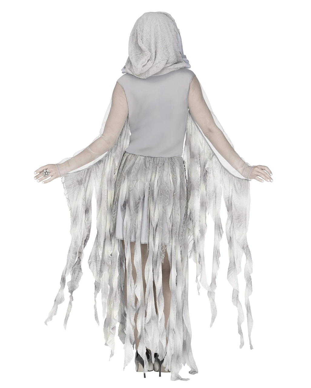 Das verzauberte Geisterfee Damenkostüm ist in den Größen S/M und M/L erhältlich. Es besteht aus weichem, feinen Stoff. Der graue Fetzenumhang erinnert an ein zerrissenes Brautkleid. Eine befestigte Kette sowie Spinnweben Applikationen sorgen für schaurige Details. Das Halloween Geisterkostüm für Damen hat außerdem eine Kapuze. Die passende Perücke kannst du dir mit Todesfürstin Lockenperücke grau dazu kaufen um den Look perfekt zu machen.